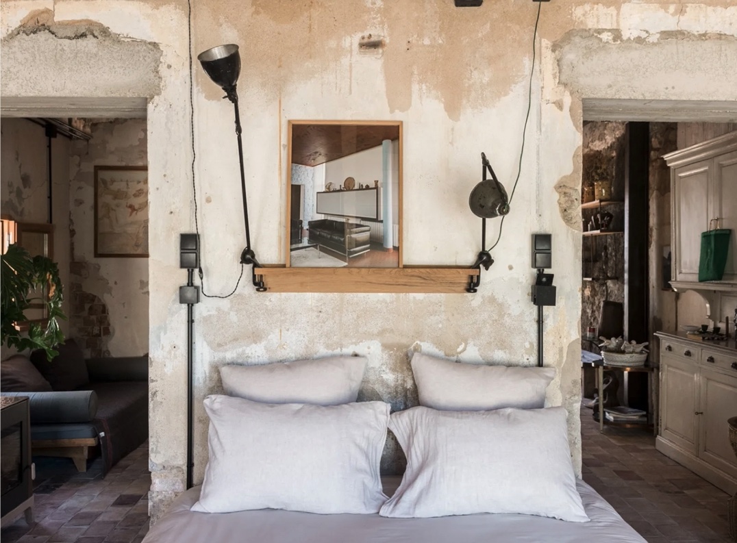 Partout, un mobilier recyclé, quelques pépites chinées aux Puces d’Avignon ou de Marseille et un concentré de bonnes idées. Lit baldaquin revisité à partir d’une toile de bateau, liseuses rappelant les télescopes des sous-marins, colliers de flotteurs colorés suspendus, et coffre en coquillages. On aime le coin salon de la Suite – qui assure la pause élégante du marin – et l’opus miroir des salles de bain, qui laisse toujours entrer un coin de ciel bleu. Les manettes des robinets rappellent les machineries des bateaux et les encadrements en bois jouent la touche chic du cabanon.